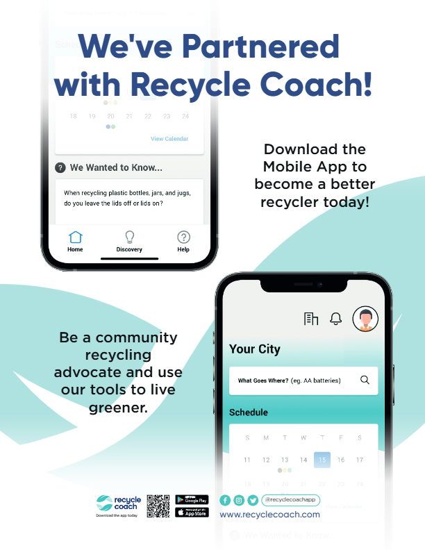 We are happy to announce that we have partnered with Recycle Coach to help aid in your recycling efforts. The Recycle Coach app will help assist with notifications and up to date recycling information.