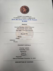 PLEASE BEWARE OF A SCAM THAT IS GOING AROUND CURRENTLY. BELOW ARE PICTURES OF A FAKE BILL FROM THE COUNTY OF ISABELLA PLANNING AND ZONING. THIS IS NOT REAL. THE COUNTY DOES NOT TAKE WIRE TRANSFERS AS PAYMENTS EITHER.