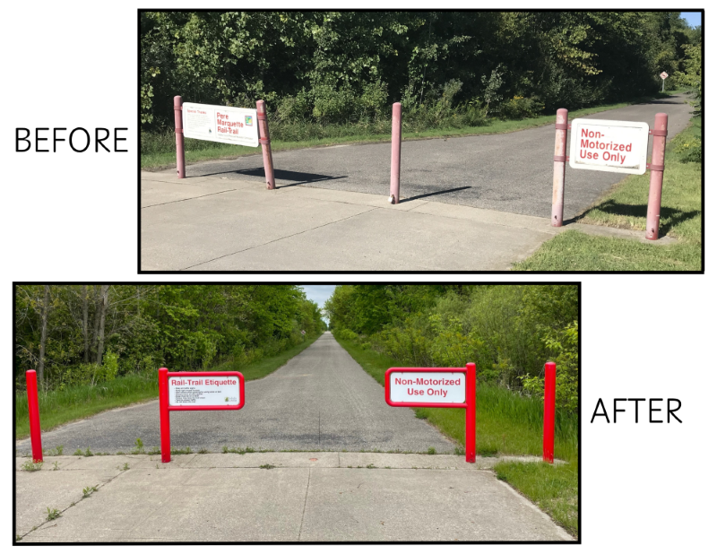 Isabella County Parks has completed the second phase of the Pere Marquette Rail Trail Beautification Project. Aging trail bollards have been replaced with new, specialized rail-trail gates, and all trail signage along the 8.25-mile section of trail in Isabella County has been updated.